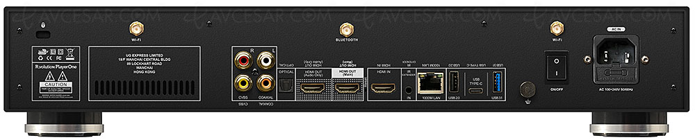 Antes de volver más adelante con más detalle a las caracterÃsticas del reproductor multimedia R_volution, una visual de su panel trasero nos habla de su conectividad: una entrada HDMI, una salida HDMI CEC 2.0a, un HDMI 1.4, una salida óptica, una salida óptica, una salida RCA estéreo, una salida compuesta, un puerto USB-C, dos puertos USB (uno 2.0 más otro 3.0) y un puerto Ethernet.