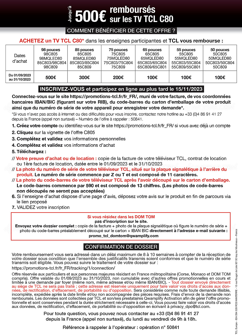 • 500 € por la compra de un televisor TCL 98C805/C803/C804/C809/MQLED80 (98'', 249 cm)