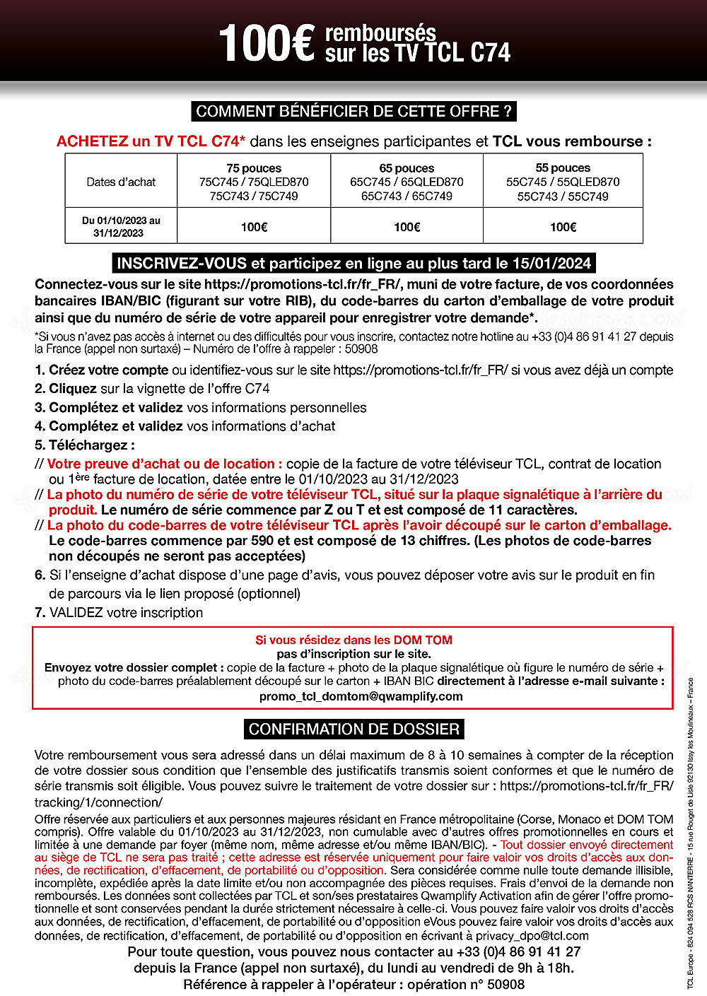 Desde el 1 de octubre y hasta el 31 de diciembre, por cualquier compra de un televisor TCL C745 QLED entre los siguientes modelos, la marca te reembolsará: