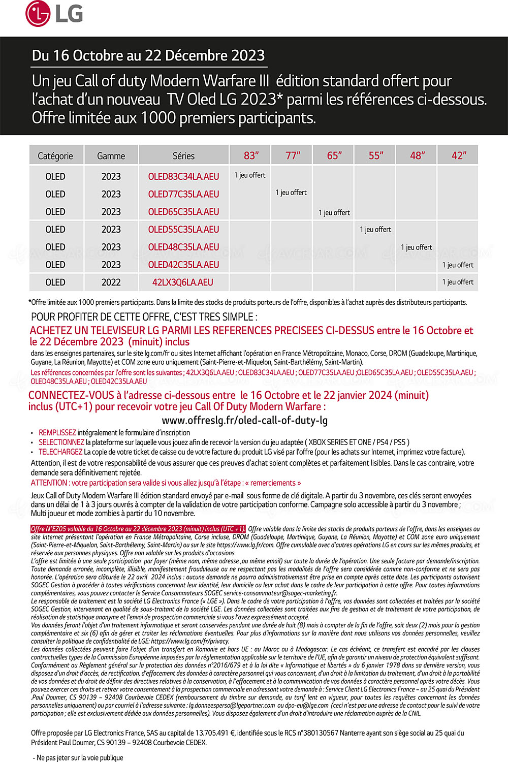 Socio televisivo oficial del nuevo videojuego Call Of Duty: Modern Warfare III, LG Electronics France ofrece el juego en versión digital para consola (PlayStation 4 o PlayStation 5, Xbox One, Xbox Series X o Xbox Series S) para 1.000 primeros compradores de un televisor Oled LG C3 o LG Flex (ver foto arriba), hasta el 22 de diciembre de 2023.