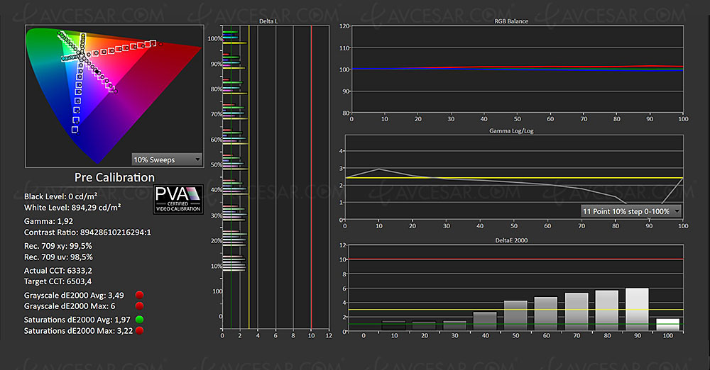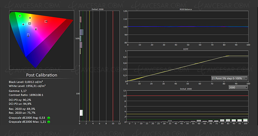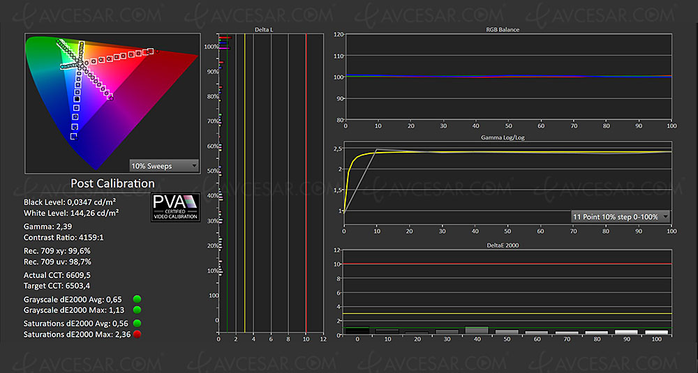 Una vez hecho esto, la señal SDR se fija en casi 144 nits con un Delta E de la escala de grises media en 0,65, 056 para toda la gama, cifras más que perfectas para ver TDT, DVD o Blu-Ray.