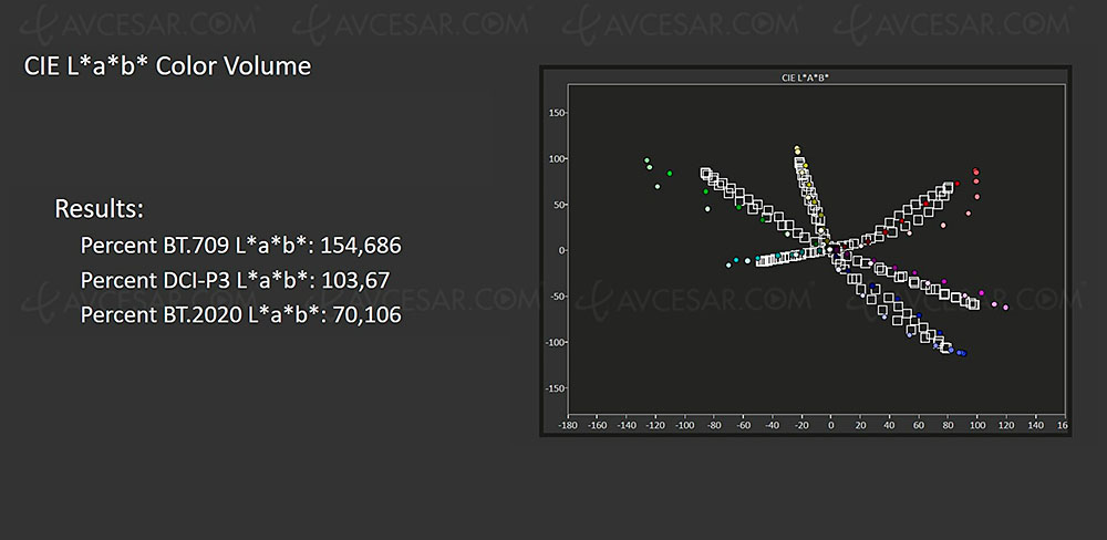 Finalmente, el volumen de color es muy bueno (ver la primera captura a continuación), con 154,7% de Rec.709, 103,7% de DCI-P3 y 70% de Rec.2020. Y el pico de luz en modo Cine, una vez calibrado el televisor, muestra 3700 nits en 10% APL y 647,6 nits en 100% APL (ver segunda captura a continuación), un valor verdaderamente excepcional.