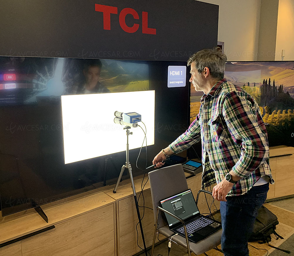 Informada de la organización deseada por TCL, AVCesar también estuvo presente con nuestro socio desde hace mucho tiempo, el calibrador profesional Cédric Louis (HC Calibrage), que se muestra a continuación, acompañado de su equipo de última generación y perfectamente perfilado. Con el objetivo de primero medir el rendimiento de estas pantallas con mucha precisión y luego calibrarlas finamente para aprovechar realmente lo que tienen en sus entrañas.