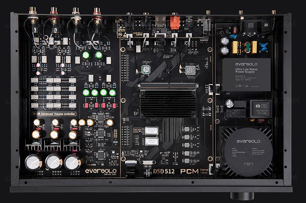 Dispuesta simétricamente, la etapa de preamplificación del EverSolo DMP-A8 se basa en componentes cuidadosamente seleccionados y amplificadores operacionales OPA1612. El circuito de volumen es del tipo R2R que combina resistencias discretas y relés de alta gama.