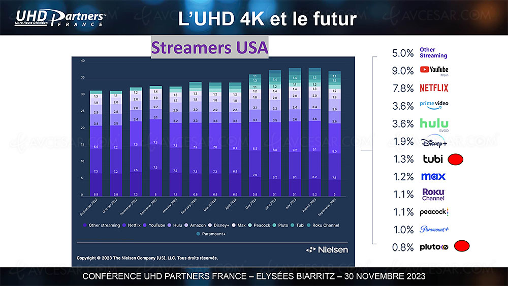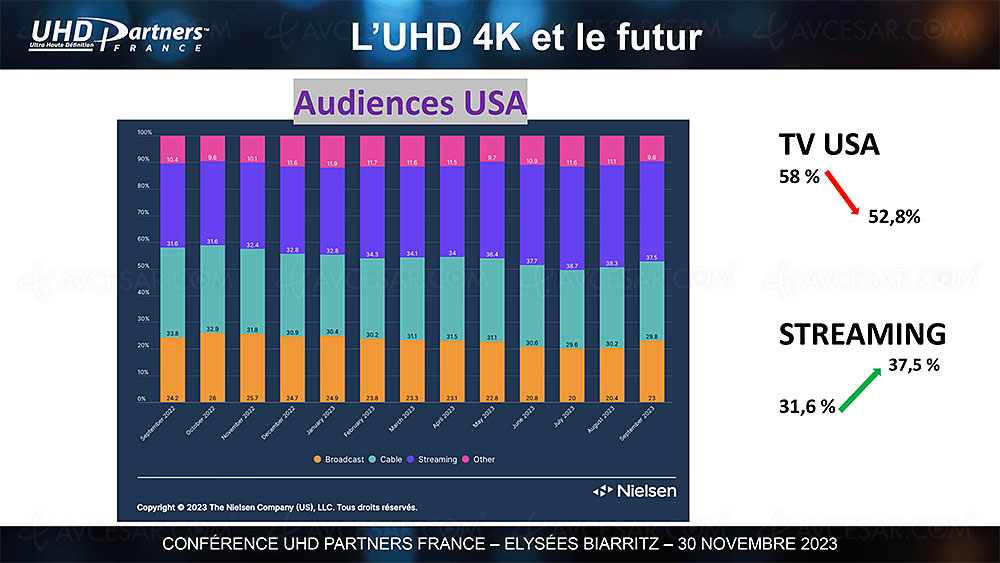 En el mercado de contenidos audiovisuales, en términos de audiencia, vemos que el sector del streaming sigue avanzando en 2023 (ver foto arriba) sumando una cuota de mercado del 37,5% en septiembre de 2023 (frente al 31,6% del año pasado para el mismo perÃodo), a diferencia del sector de la televisión, que presenta un 52,8% (frente al 58% en 2022). Sin embargo, vemos que esta progresión es más lenta que durante el perÃodo Covid-19, durante el cual el sector experimentó una explosión en sus usos. El consenso de los analistas, si bien predice una nueva caÃda de la audiencia televisiva, también anuncia que su punto más bajo está cerca. Si las cadenas de televisión “tradicionalesâ€, gratuitas o de pago, logran preservar sus contratos deportivos y su calidad de información, su descenso de audiencia estarÃa, por tanto, cerca de su fin. Sólo el tiempo permitirá verificar esto.