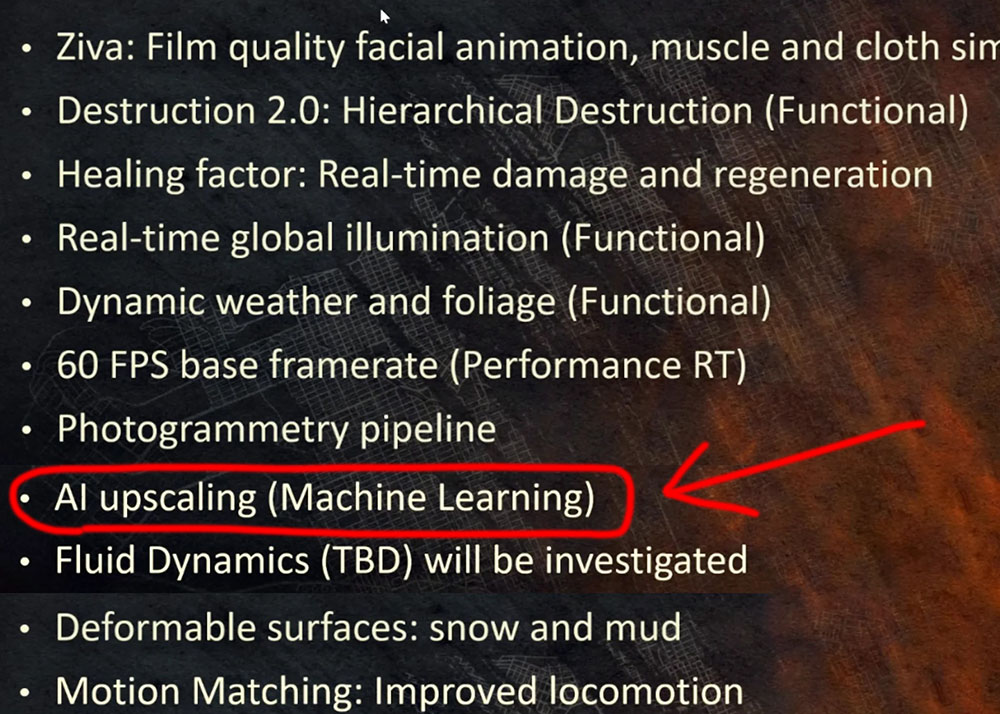 Entre los detalles técnicos enumerados, encontramos animaciones faciales mejoradas, destrucción más realista, Ray Tracing (Iluminación global) en tiempo real y otros detalles agradables. Pero lo más interesante es AI Upscaling, es decir, un mayor escalado de resolución, a través de algoritmos de inteligencia artificial.