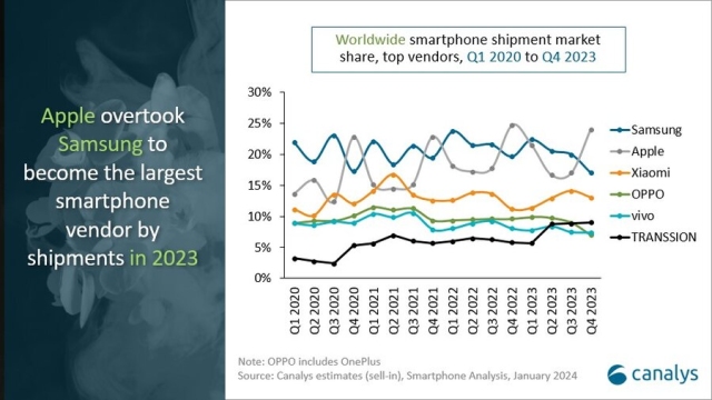 Confirmando las predicciones de verano de Counterpoint Research, otras dos firmas de análisis -IDC y Canalys- coinciden de forma independiente en las cifras de ventas de smartphones en todo el mundo en 2023: por primera vez en más de diez años Samsung pierde su lugar como superventas y lo cede a Apple.