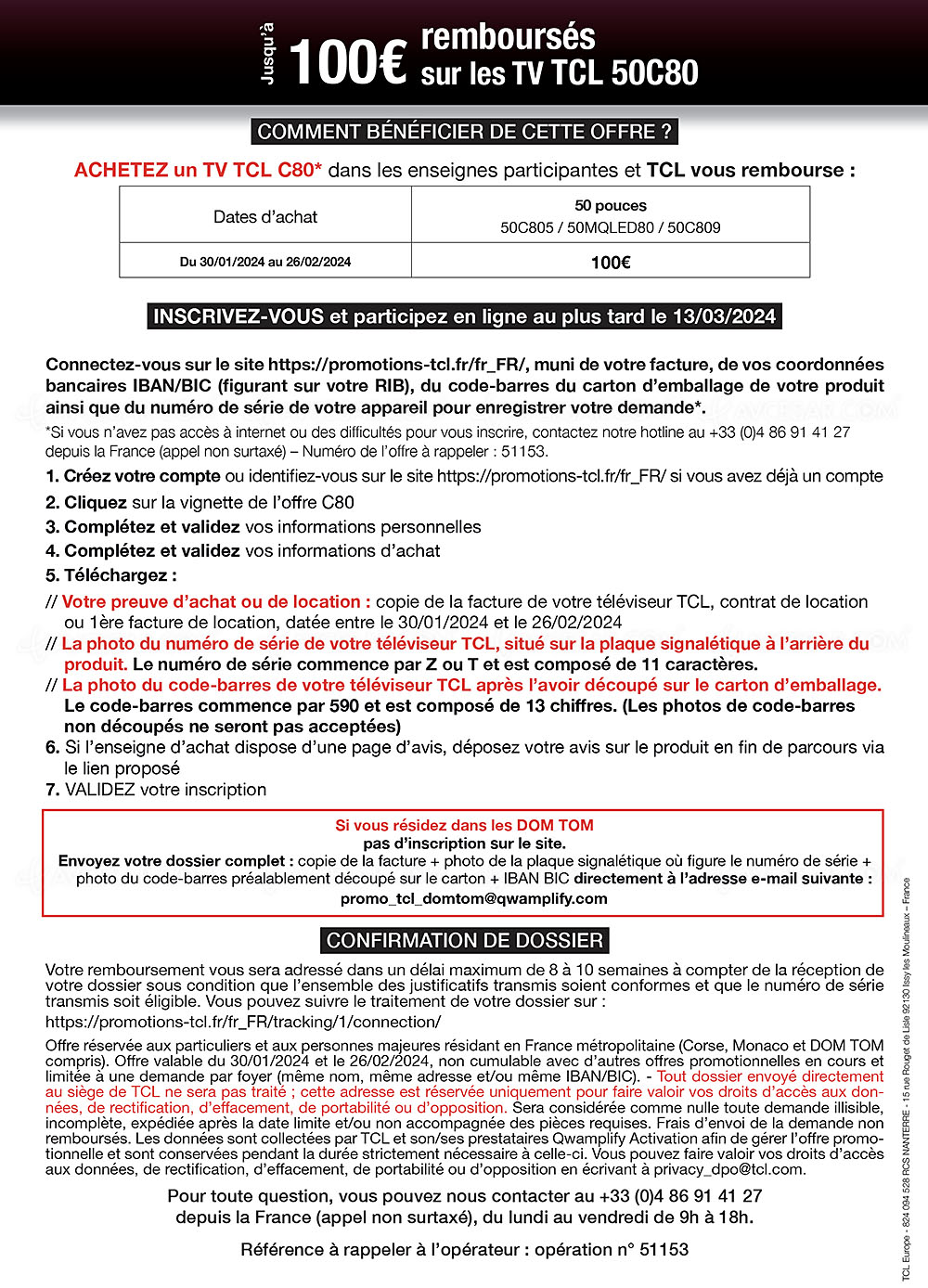 Desde el 30 de enero y hasta el 26 de febrero, por la compra de un televisor Mini LED TCL 50C805/50MQLED80/50C809 (50'', 127 cm), la marca te reembolsará 100 euros.