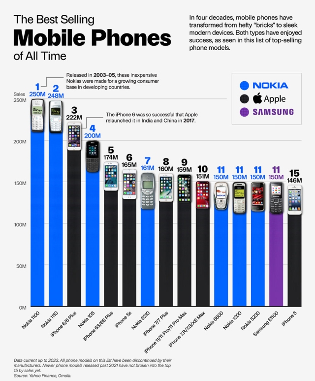 Por tanto, a lo largo de estas décadas han surgido muchos modelos de teléfonos móviles, y cuando nos preguntamos cuál se ha vendido más en el mundo, intuitivamente nos inclinamos por los más recientes. Y sin embargo… El sitio Visual Capitalist ha recopilado todos los datos necesarios para establecer un ranking de los móviles más vendidos de todos los tiempos, y en primera posición se sitúa… el Nokia 1100. Eso sí, con 250 millones de unidades vendidas en En todo el mundo, el dispositivo “vintage” está por delante de todos los iPhones que pensábamos que terminarían primeros.