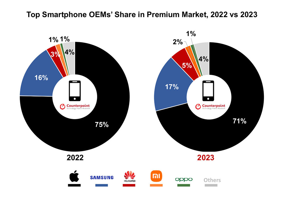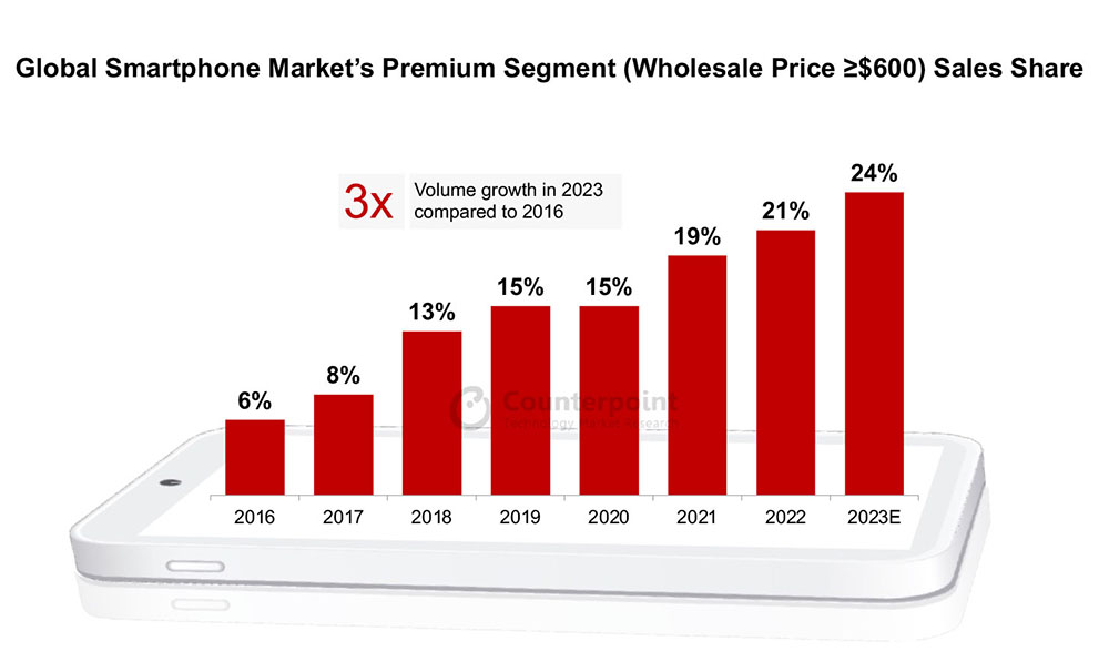 La firma Counterpoint Research estima que el mercado mundial de teléfonos inteligentes premium (modelos con precios superiores a $600) alcanzará ventas récord en 2023, con un crecimiento del 6% en comparación con 2022. Al mismo tiempo, se espera que todo el mercado experimente una caÃda anual. declive.