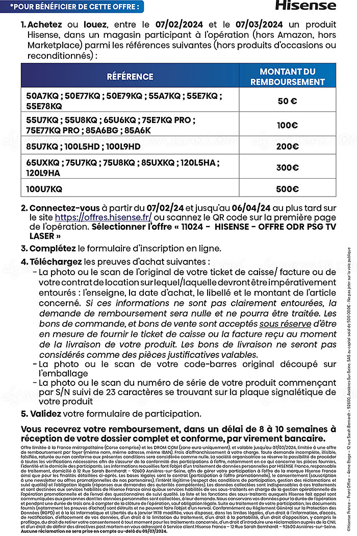 • 50€ por la compra de un televisor Hisense 50A7KQ (50' ', 127 cm), Hisense 50E77KQ (50'', 127 cm), Hisense 50E79KQ (50'', 127 cm), Hisense 55A7KQ (55'', 140 cm), Hisense 55E7KQ (55'', 140 cm) o Hisense 55E78KQ (55'', 140 cm)