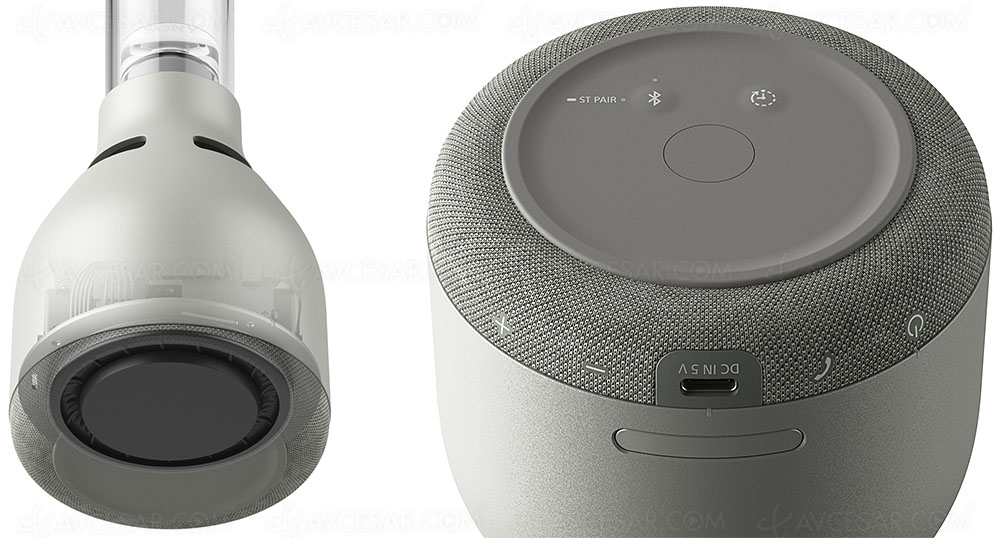 Un objeto especial es este altavoz Bluetooth 5.0 LDAC LSPX-S3 de Sony, equipado con un tweeter de vidrio cilÃndrico expuesto con tres actuadores. Este material ofrece agudos claros y potentes, mientras que la forma difunde el sonido de forma homogénea. También es de destacar un diafragma de 46 mm para medios equilibrados y un radiador pasivo para graves claros.