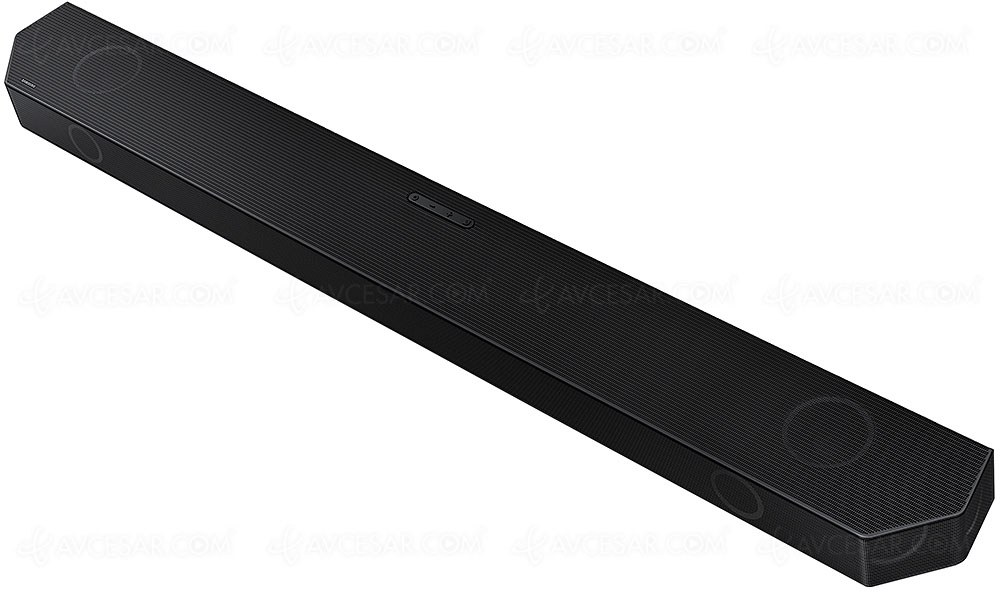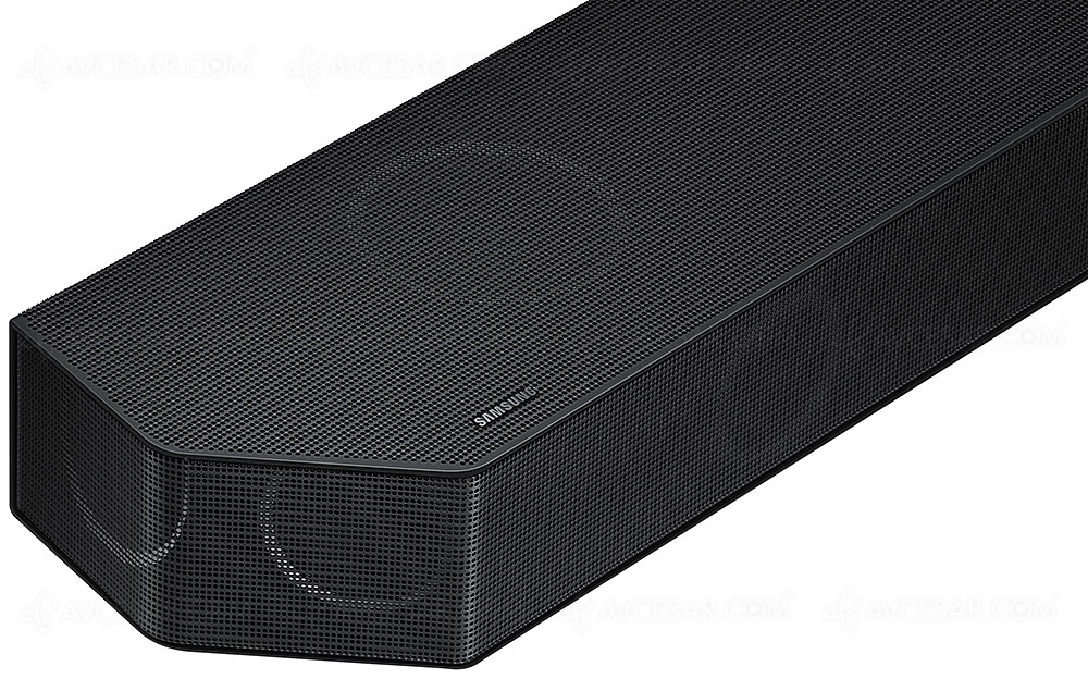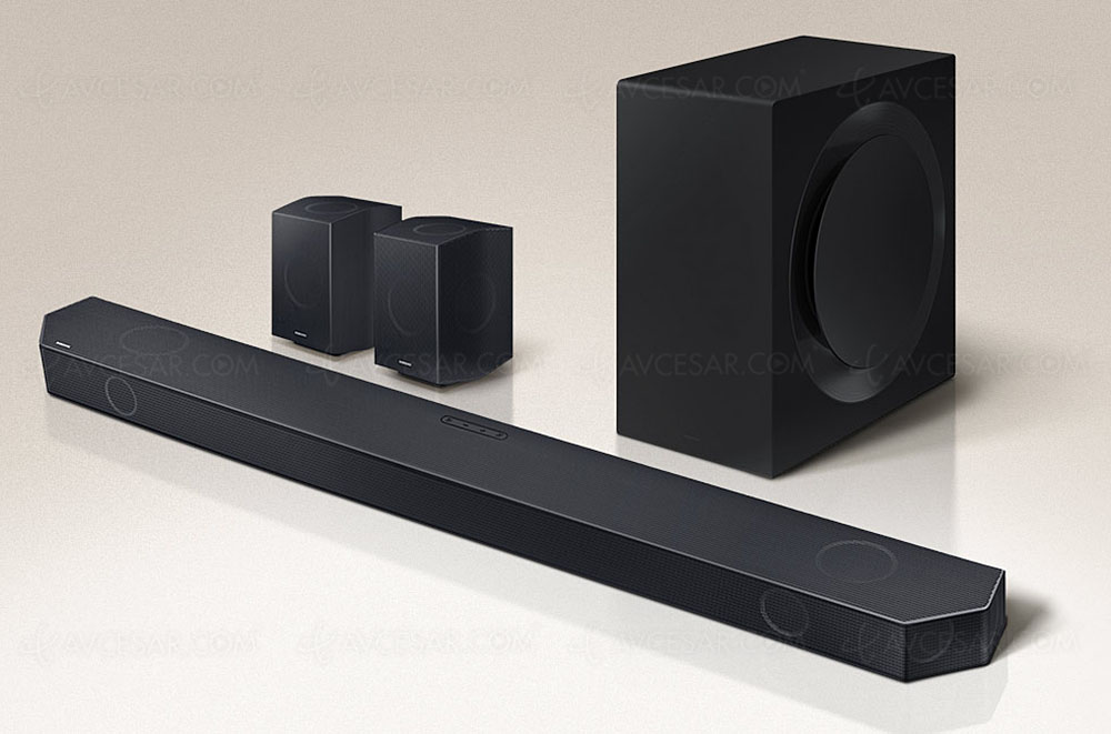 El Samsung HW-Q995D viene con un kit de altavoces envolventes inalámbricos para recrear un entorno real de sonido envolvente (ver foto arriba). Es decir, la potencia total entregada por la barra de sonido acompañada de su subwoofer de 8'' (20,32 cm) y sus envolventes (frontal + lateral + altavoz Up-Firing para cada uno) arroja 656 W para un total de 22 altavoces en configuración 11.1.4. Cada extremo de la barra de sonido tiene dos parlantes para ampliar aún más el espacio de sonido. El subwoofer, equipado con calibración automática, sigue siendo un ejemplar inalámbrico.