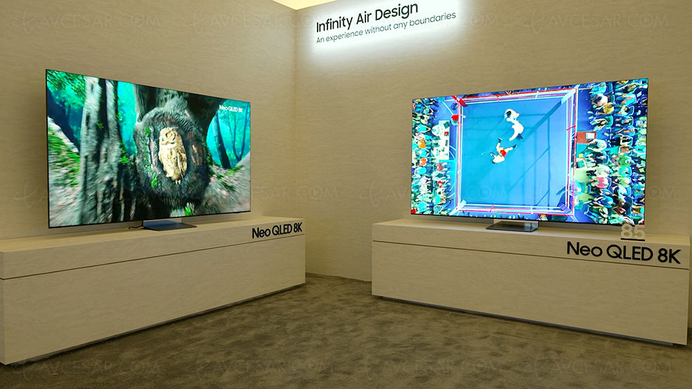 Finalmente, si aún se requiere el diseño Infinity de los televisores Samsung 8K Neo QLED, las pantallas Samsung QN800D cuentan con el diseño Infinity Air para una delicadeza excepcional, sin embargo, sin pantalla. el de los televisores QN900D (12,9 mm como recordatorio), además de un soporte con acabado efecto espejo que da la impresión de que la pantalla está flotando en el aire (ver las dos fotos a continuación).