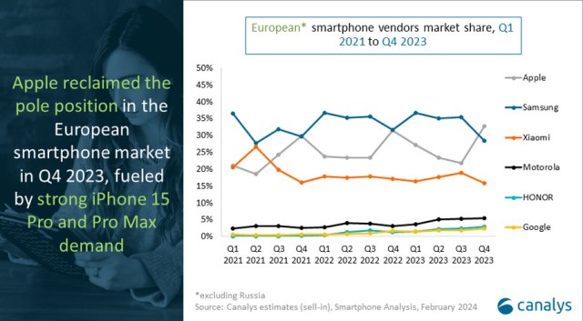 Europa, lÃder Apple en el último trimestre de 2023, lÃder Samsung en el año 2023££££