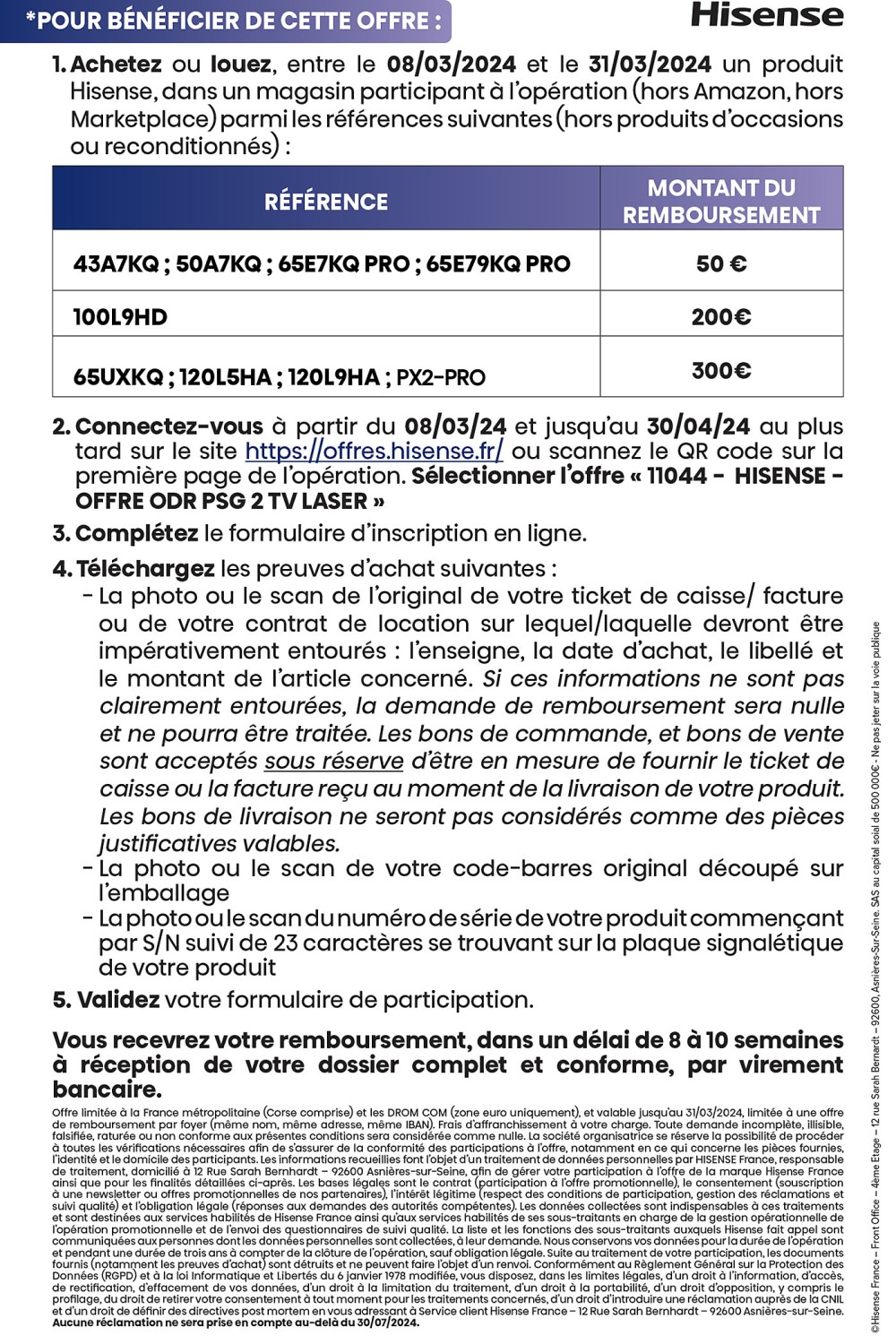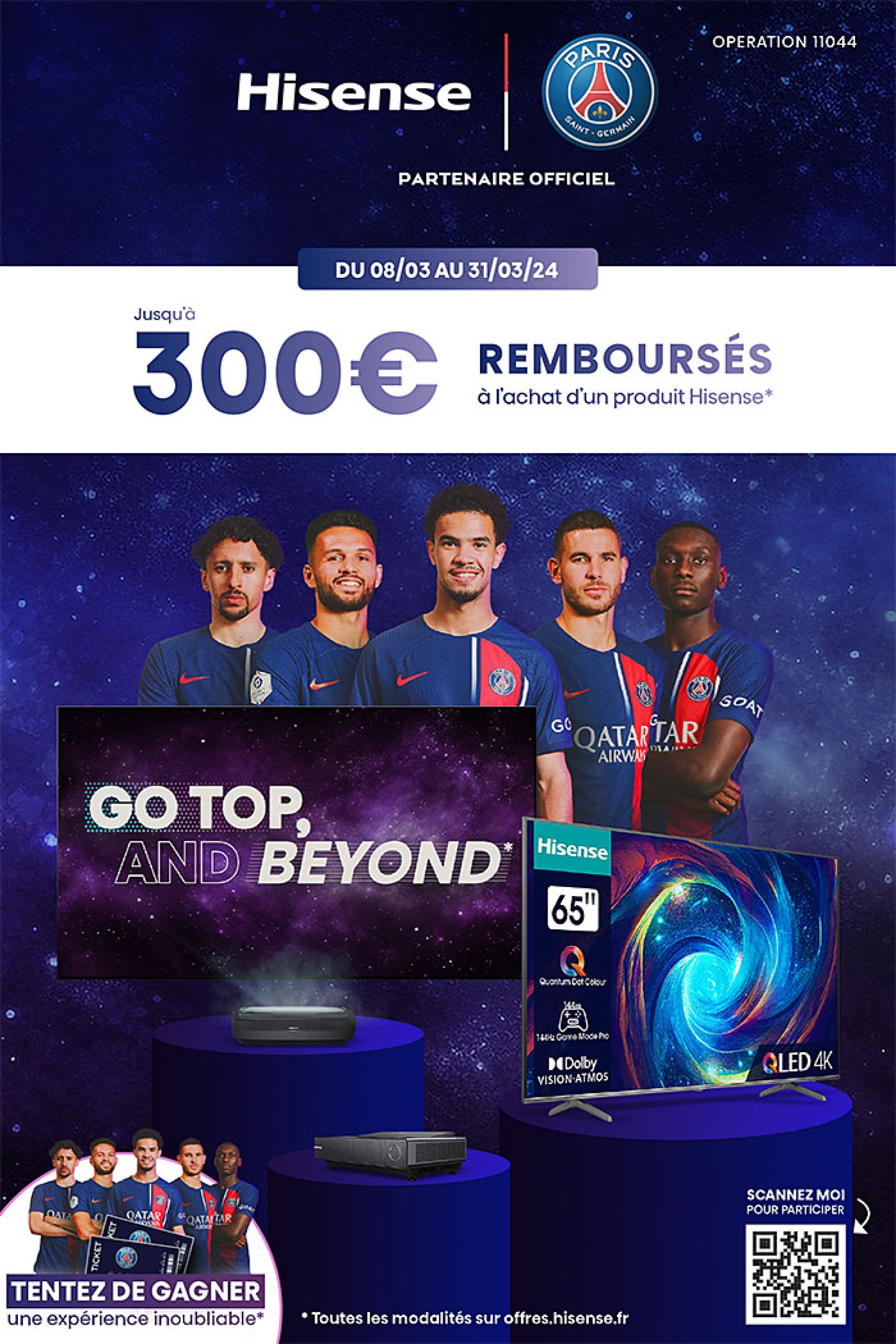 • 300€ por la compra de un Hisense 65UXKQ TV (65'', 165 cm), Laser TV Hisense 120L5HA (120'', 305 cm) o Hisense 120L9HD (120'', 305 cm)