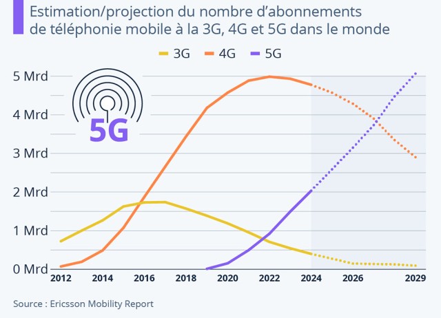 Además, es el primer estándar de comunicación inalámbrica que motiva el desarrollo y adopción de tecnologÃas como Internet de objetos, realidad virtual y realidad aumentada, asà como aplicaciones como cirugÃa remota y vehÃculos autónomos. Según el último estudio Mobility Report de Ericsson, hoy en dÃa hay 1.500 millones de abonados 5G en el mundo (cifras de diciembre de 2023), y el umbral de los 2.000 millones deberÃa superarse este año, más rápido de lo que lo hizo el 4G. En cuanto al 3G, ni siquiera habÃa alcanzado esta cifra cuando fue superado por el 4G. Ilustración: Statista