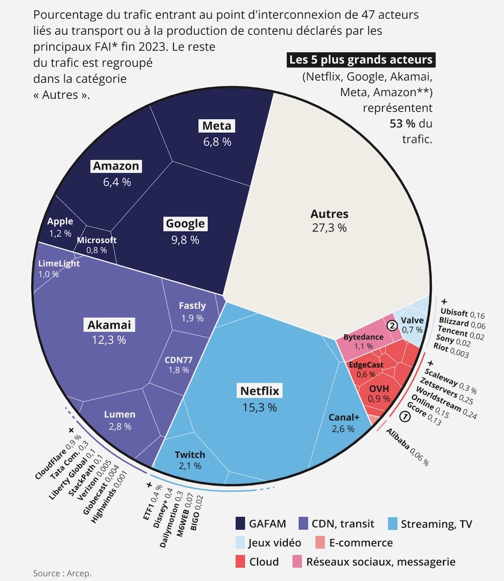 Según las últimas cifras de Arcep (Autoridad Reguladora de las Comunicaciones y Correos Electrónicos), a finales de 2023, el tráfico de Internet procedente de los principales proveedores de acceso en Francia estaba ocupado en un 53% por los lÃderes Netflix, Google, Akamai, Meta y Amazon, una ligera disminución con respecto al 54% del año anterior.