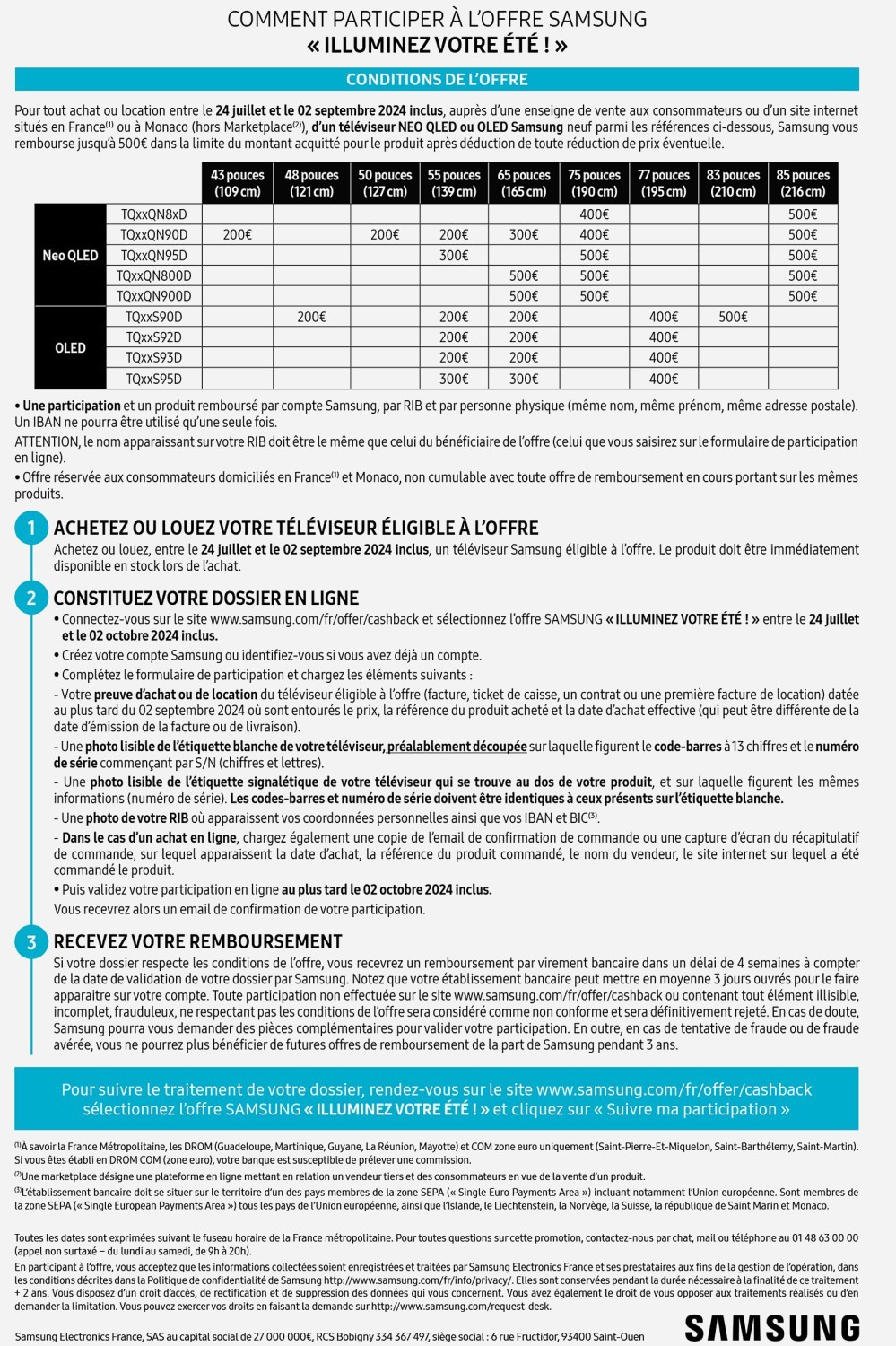 Hasta el 2 de septiembre de 2024, por cualquier compra de un televisor al que se hace referencia a continuación (haz clic en su referencia para saber más sobre el producto), la marca te reembolsará: • 200 € por un televisor Samsung TQ43QN90D, Samsung TQ50QN90D, Samsung TQ55QN90D, Samsung TQ48S90D, Samsung TQ55S90D, Samsung TQ55S92D, Samsung TQ55S93D, Samsung TQ65S90D, Samsung TQ65S92D o Samsung TQ65S93D • 300 € para un Samsung TQ55QN95D, Samsung TQ55S95 TV D, Samsung TQ65QN90D o Samsung TQ65S95D • 400 € para un televisor Samsung TQ75QN8xD, Samsung TQ75QN90D, Samsung TQ77S90D, Samsung TQ77S92D, Samsung TQ77S93D o Samsung TQ77S95D • 500 € para un televisor Samsung TQ83S90D, Samsung TQ85QN8xD, Samsung TQ85QN90D, Samsung TQ85Q N95D, Samsung TQ85QN800D o Samsung TQ85QN900D
