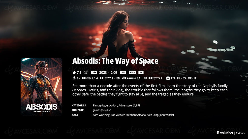 El R_volution PlayerMini se basa en un principio similar: ofrece la posibilidad de copiar tus propias pelÃculas/series o discos de música al R_volution [abc ]Nas[/abc] (caja de disco duro de red, ver foto a continuación), para luego beneficiarse de él completamente desmaterializado mediante una aplicación dedicada, R_video. Este último, gráficamente magnÃfico y con fondos animados, ofrece el cartel de la pelÃcula, toda la información técnica asociada, su distribución... La aplicación también permite navegar por su biblioteca de tÃtulos a través de varios filtros (tÃtulo, actor, director, categorÃas, fecha de estreno). , duración, etc.), agrupar y gestionar sagas automáticamente (Star Wars, Indiana Jones, Juego de Tronos, etc.), lanzar un tráiler, etc. Todo con una velocidad sin precedentes.