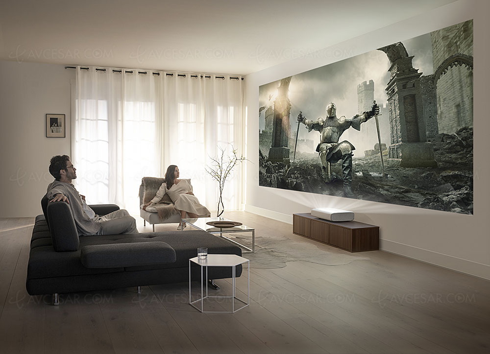 También encontramos un sintonizador dual [abc]DVB-T[/abc]/[abc]DVB-S[/abc], un chip [abc]DLP[/abc] de 0,66" dotado de una resolución nativa de 2.716 x 1.528 píxeles (y lamentablemente bloqueado a 60 Hz. La definición Ultra HD 4K se simula utilizando la tecnología de wobulación exclusiva de Texas Instrument llamada XPR2, el diseño evoluciona en los márgenes con una fachada ligeramente curvada. más redondeada.
