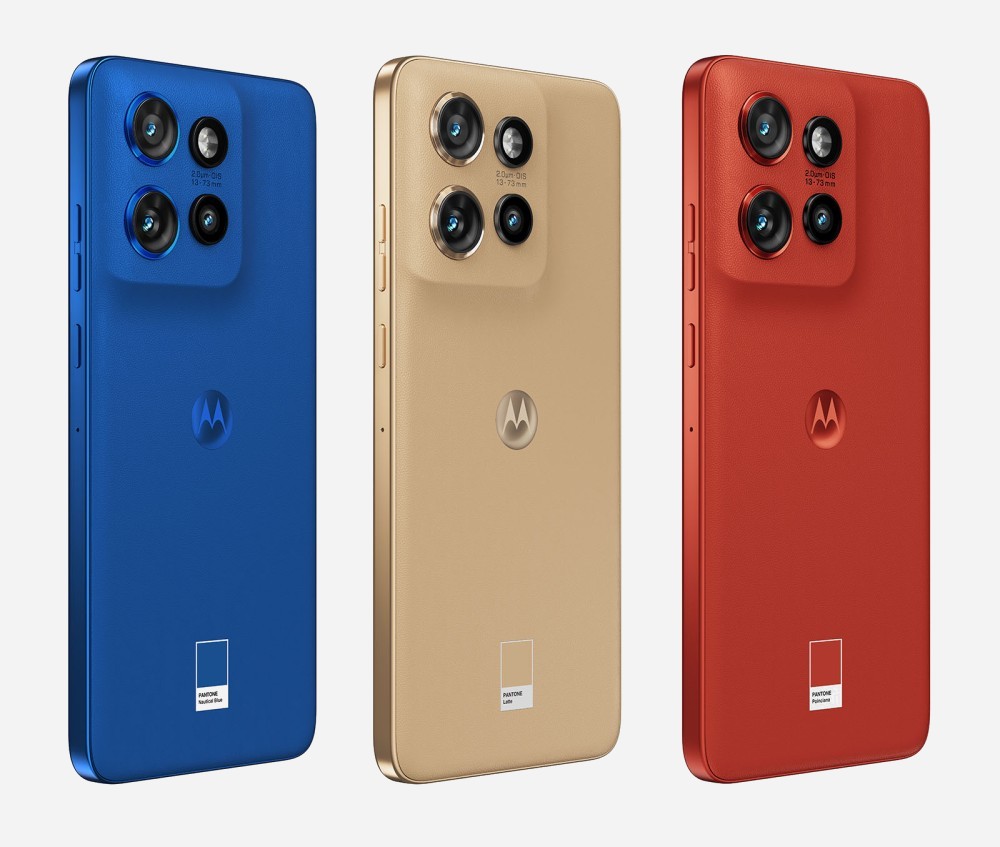 Cubierto con una funda de cuero vegano, el teléfono inteligente Motorola Edge 50 Neo debe sus cuatro colores originales, Poinciana, Latte, Grisaille y Nautical Blue, a una asociación con Pantone. Además de una apariencia hermosa, está equipado con cuatro fotosensores en la parte posterior, respaldados por algoritmos de IA para una mayor calidad de imagen.