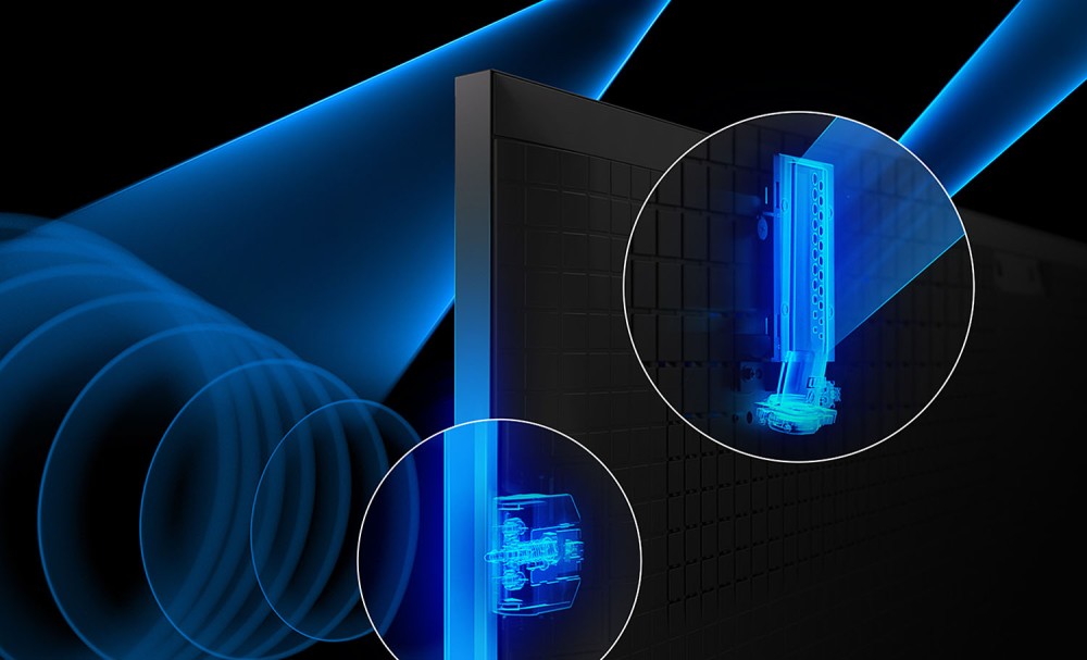 La sección de audio de la pantalla Sony, que ofrece una potencia total de 70 W (compuesta por seis altavoces de 10 W cada uno, más dos tweeters verticales de 5 W, cf. foto de abajo). También se incluye compatibilidad con [abc]Dolby Atmos[/abc] y Acoustic Center Sync, lo que permite activar el sistema de sonido del televisor junto con una barra de sonido Sony para ampliar la experiencia de sonido.