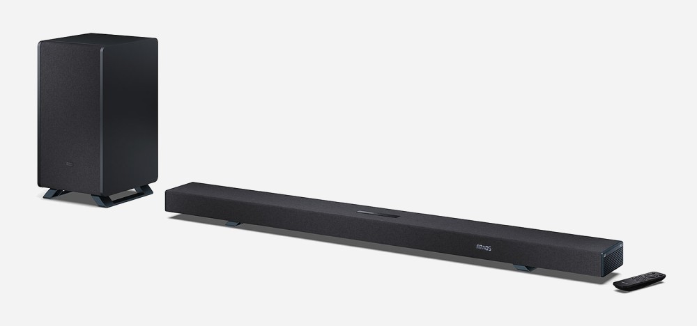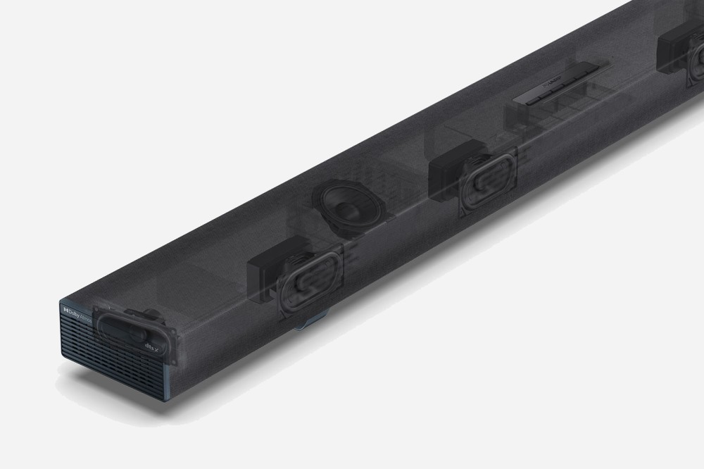El Sharp HT-SBW55121, compatible con [abc]Dolby Atmos[/abc] 5.1.2 y [abc]DTS:X[/abc], cuenta en total nueve altavoces, incluido el del subwoofer inalámbrico externo, un modelo equipado con un [abc]boomer[/abc] de 16,5 centímetros. La barra de sonido tiene capacidad para cuatro altavoces frontales de banda ancha de 40 x 90 mm, dos altavoces de 37 x 86 mm colocados a los lados dedicados a efectos envolventes más dos altavoces de banda ancha Up-Firing de 6,35 milímetros. Todo funciona con Clase D con una potencia total de 650 vatios.