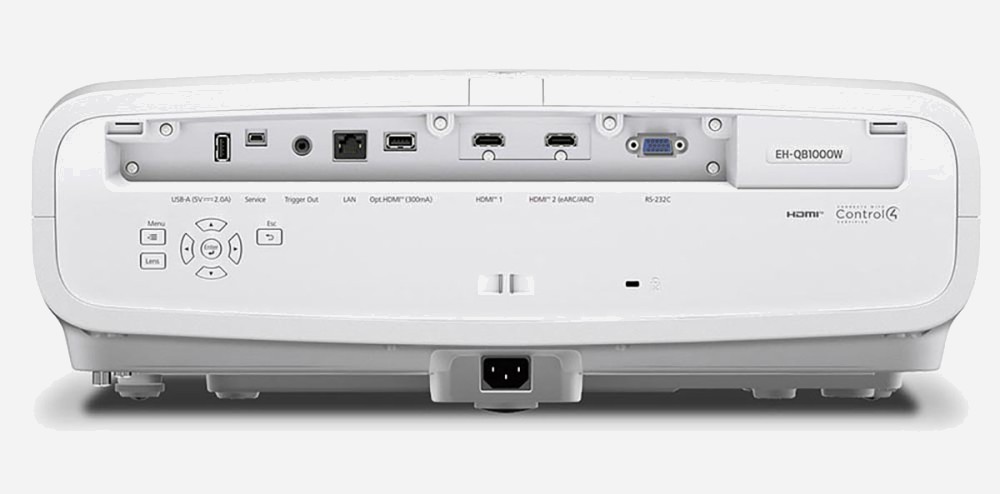 La conectividad de la Epson EH-QB1000 (ver foto arriba) cuenta con dos entradas [abc]HDMI[/abc] 2.1 40 Gbps certificadas [ abc]HDCP[/ abc] 2.3 y [abc]ALLM[/abc] (gestión [abc]ARC[/abc] en uno de ellos y 4K), dos puertos [abc]USB[/abc] Host 2.0, un puerto mini USB-B, un conector [abc]RS-232[/abc]C, un puerto [abc]Ethernet[/abc] y una salida [abc]Trigger[/abc] de 12V. Epson especifica que el retardo de entrada es bajo, menos de 20 ms en presencia de una señal [abc]2 160p[/abc]/60, menos de 10 ms con una señal de 4K/120 hercios.
