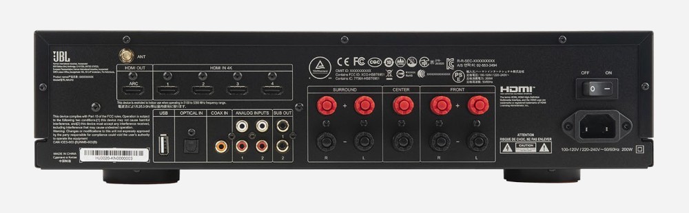 Los conectores del JBL MA310 reúnen cuatro [abc]HDMI[/abc] 2.0 [abc]CEC[/abc] certificado [abc]HDCP[/abc ] entradas 2.2 y transparente a señales [abc]Deep Color[/abc], [abc]xvYCC[/abc], 3D y [abc]HDR10[/abc], además de una salida con [abc]ARC[/ ABC]. También está presente una entrada [abc]óptica[/abc], una [abc]coaxial[/abc], dos entradas estéreo [abc]RCA[/abc] y dos salidas de subwoofer. Sin olvidar un puerto [abc]USB[/abc] y cinco pares de bornes de tornillo. En términos de conectividad, encontramos compatibilidad con [abc]Bluetooth[/abc].