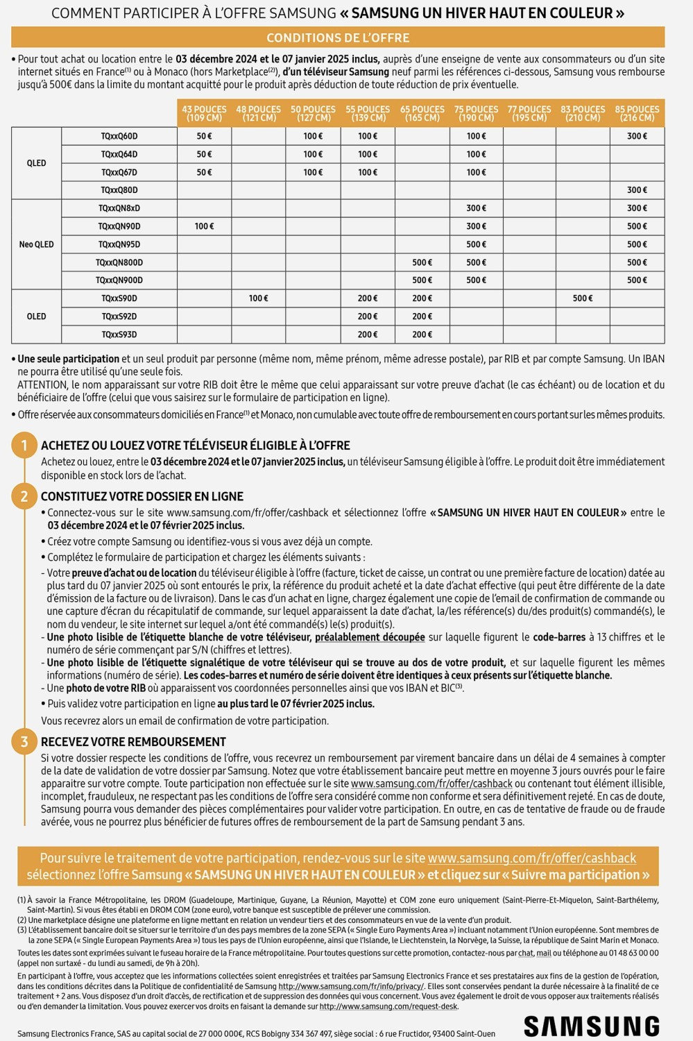 Hasta el 7 de enero de 2025, por cualquier compra de un televisor listado a continuación (haz clic en su referencia para saber más sobre el producto), la marca te reembolsará: • 50€ por un televisor Samsung TQ43Q60D, Samsung TQ43Q64D o Samsung TQ43Q67D • 100 € por un televisor Samsung TQ43QN90D, Samsung TQ50Q60D, Samsung TQ48S90D, Samsung TQ50Q64D, Samsung TQ50Q67D, Samsung TQ55Q60D, Samsung TQ55Q64D, Samsung TQ55Q67D, Samsung TQ75Q60D, Samsung TQ75Q64D o Samsung TQ75Q67D • 200 € por un televisor Samsung TQ55S90D, Samsung TQ55S92D, Samsung TQ55S93D, Samsung TQ65S90D, Samsung TQ65S92D o Samsung TQ65S93D • 300 € para un Samsung TQ75QN8xD, Samsung TQ75QN90D, Samsung TQ85Q60D, Samsung TQ85Q80D o Samsung TV TQ85QN8xD • 500 € para un televisor Samsung TQ65QN900D, Samsung TQ75QN95D, Samsung TQ75QN800D, Samsung TQ75QN900D, Samsung TQ83S90D, Samsung TQ85QN90D, Samsung TQ85QN95D, Samsung TQ85QN800D o Samsung TQ65QN900D
