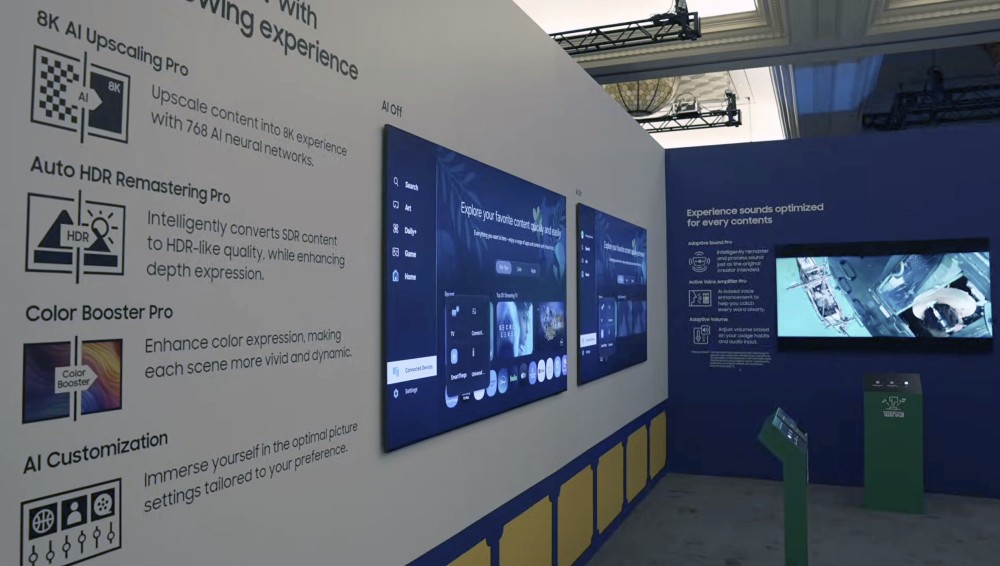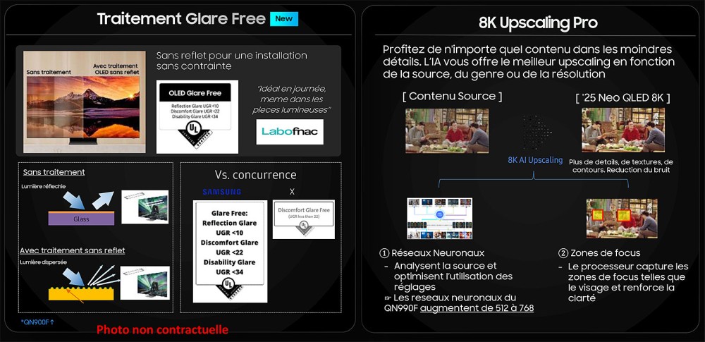 Samsung QN990F, especificaciones principales££££ Entre las otras especificaciones premium de las pantallas QN990F, el Infinity Design inauguró el año pasado en televisores QN900D, un panel que cubre Glare Free (ver foto arriba) directamente del Samsung S95D serie 2024 vintage, mejorado aún más (haga clic en la referencia del televisor Samsung TQ65S95D para descubrir su prueba completa realizada por la redacción de AVcesar) y un potente procesador equipado con 768 Deep Módulos de aprendizaje (en comparación con 512 en 2024 en las referencias QN900D) para obtener resultados aún mejores efecto sorprendente del proceso 8K Upscaling Pro (ver foto arriba y abajo).