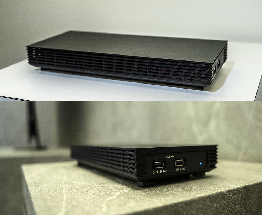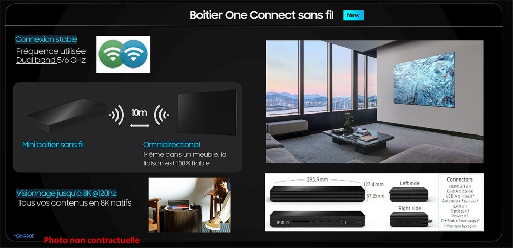 Volviendo al caso en sí, podemos ver en la foto de arriba que la conexión inalámbrica es omnidireccional y robusta: el One Connect Wireless se puede esconder en cualquier lugar de un mueble, eso obras. Por lo demás, su tamaño es más compacto que las carcasas anteriores, pero es más grueso que las últimas generaciones.