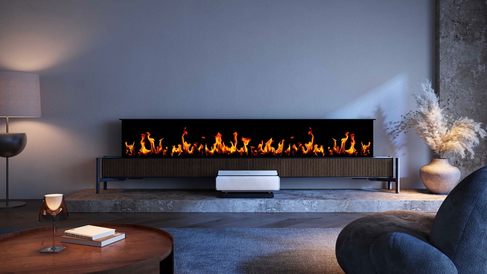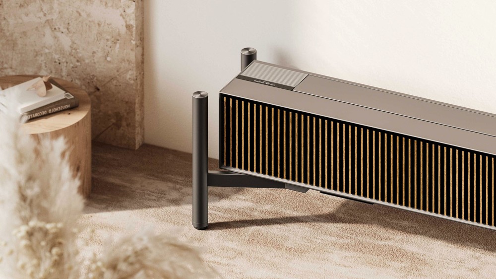 Motorizada, la pantalla se puede desplegar parcialmente hasta un tercio de su altura para, por ejemplo, difundir una luz suave y cálida, como una chimenea, o incluso información tipo widget. (ver foto en la parte superior de esta noticia). Y la carcasa de almacenamiento de la pantalla también alberga la barra de sonido Harman Kardon.