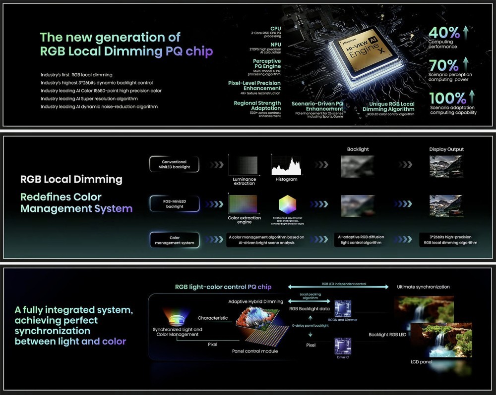 Los televisores Hisense UX están equipados con un panel LCD nativo [abc]Ultra HD[/abc] [abc]4K[/abc] de 165 Hz o 288 Hz mediante tecnología HSR (Hardware Super Resolution). El procesador integrado, llamado Hi-View Engine X, es el más potente jamás utilizado por Hisense en sus emisoras. Fue desarrollado específicamente para los altos requisitos de recursos de la retroiluminación Mini LED RGB. La compensación de movimiento MEMC está presente. Lo mismo ocurre con las funciones [abc]ALLM[/abc], [abc]VRR[/abc], AMD FreeSync Premium y [abc]HDR Dolby Vision[/abc].