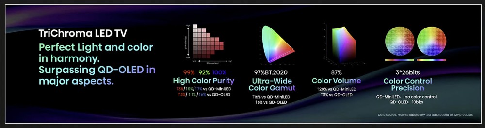 Al igual que su “hermano mayor” 116UX, el Hisense 100UX Mini LED RGB Ultra HD 4K cuenta con un sistema de retroiluminación llamado RGB Local Dimming Technology. Si para el ejemplar de 116" hay 15.680 zonas, cada una equipada con tres diodos (uno rojo, uno verde, uno azul, el filtro Quantum Dot desaparece) para colores de una pureza y una energía sin precedentes, no tenemos ninguna información sobre el sujeto para 100UX Sin embargo, en el lado de la colorimetría, se mantiene una cobertura del 97% de la gama Rec.2020.