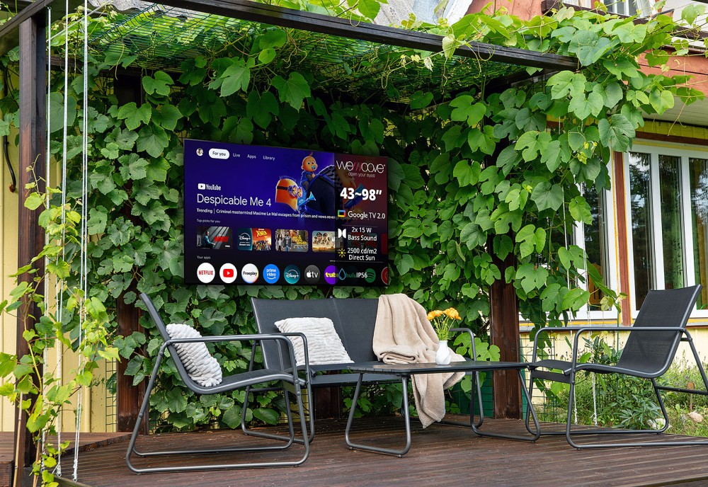 Con certificación IP56, los Smart TV Vivaldi Serie 1000 tienen un grosor de 9 cm y están diseñados para instalarse en el jardín, en la terraza o en el borde de la una piscina, para disfrutar de una sesión de cine al aire libre, o dar una nueva dimensión a las retransmisiones deportivas. La pantalla IPS garantiza un amplio ángulo de visión de 178° y su sensor de luz ambiental puede variar el brillo de la pantalla dependiendo de las condiciones externas.