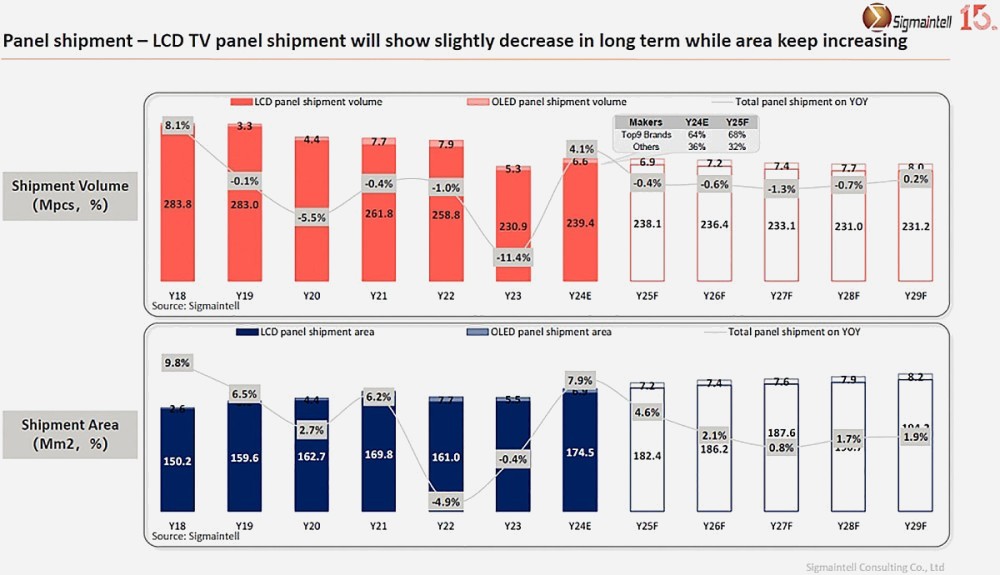 Según Sigma Intel, se esperaba que los envíos de paneles de televisores LCD en 2024 fueran de 239,4 millones de unidades, 238,1 millones en 2025 , 236,4 millones en 2026, 233,1 millones en 2027, 231 millones en 2028 y 231,2 millones en 2029 (ver gráfico a continuación).