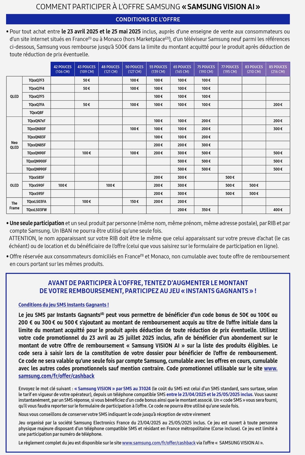 Atención, antes de participar en la oferta de reembolso titulada “Samsung Vision AI”, intenta aumentar su importe en 50 €, 100 €, 200 €, 200 € o 500 € participando en el juego “Instant Wins” (los términos y condiciones se pueden descubrir más arriba) o en los detalles de la oferta disponibles en las tiendas participantes y en el sitio web de la marca: www.samsung.com/fr/offer/cashback