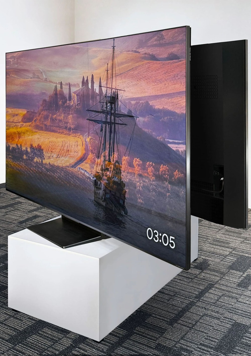 Por último, está presente la tecnología DLG (Dual Line Gate). Esta última, al reducir la resolución vertical a la mitad (por lo tanto, en [abc]1080p[/abc] y no [abc]2 160p[/abc]), ofrece una pantalla de 288 Hz para una experiencia de juego más fluida y agradable. TCL C9K, diseño minimalista££££ Otra característica destacable de los televisores TCL C9K es la casi completa desaparición del marco del panel LCD. Este sigue siendo visible en la parte inferior del panel LCD, pero es muy fino en el resto del panel (véanse las fotos de arriba y de abajo). Si a esto le sumamos una imagen que literalmente roza el borde de la pantalla (el borde negro de La matriz es solo un recuerdo, la imagen ocupa el 100% del panel. El resultado final es absolutamente espléndido. ¡Sobrio, elegante y prestigioso! Último detalle: los televisores TCL C9K cuentan con un soporte central.