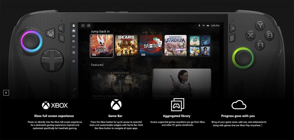 ¿Cuál es la filosofía detrás de estas máquinas? Ocultar al máximo el peso de Windows para centrarse únicamente en la experiencia Xbox, con una ergonomía optimizada para los mandos de una consola portátil. Aparte del mayor rendimiento del modelo 'X', ambas máquinas comparten una apariencia similar, con la misma pantalla [abc]LCD[/abc] [abc]1080p[/abc] de 7" con frecuencia de actualización de 120 Hz y compatibilidad con [abc]VRR[/abc].