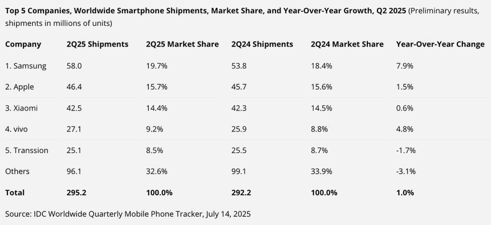 Apple es segundo con 46,4 millones de iPhones distribuidos, un 1,5% mejor que el año pasado. La caída también es dura en comparación con el primer trimestre, con los fans de la marca probablemente esperando ahora septiembre y la llegada de la nueva gama iPhone 17.