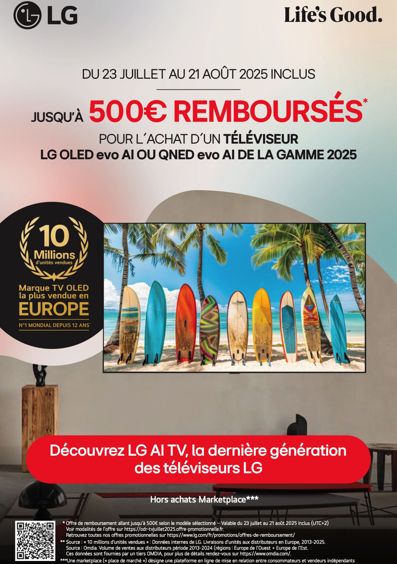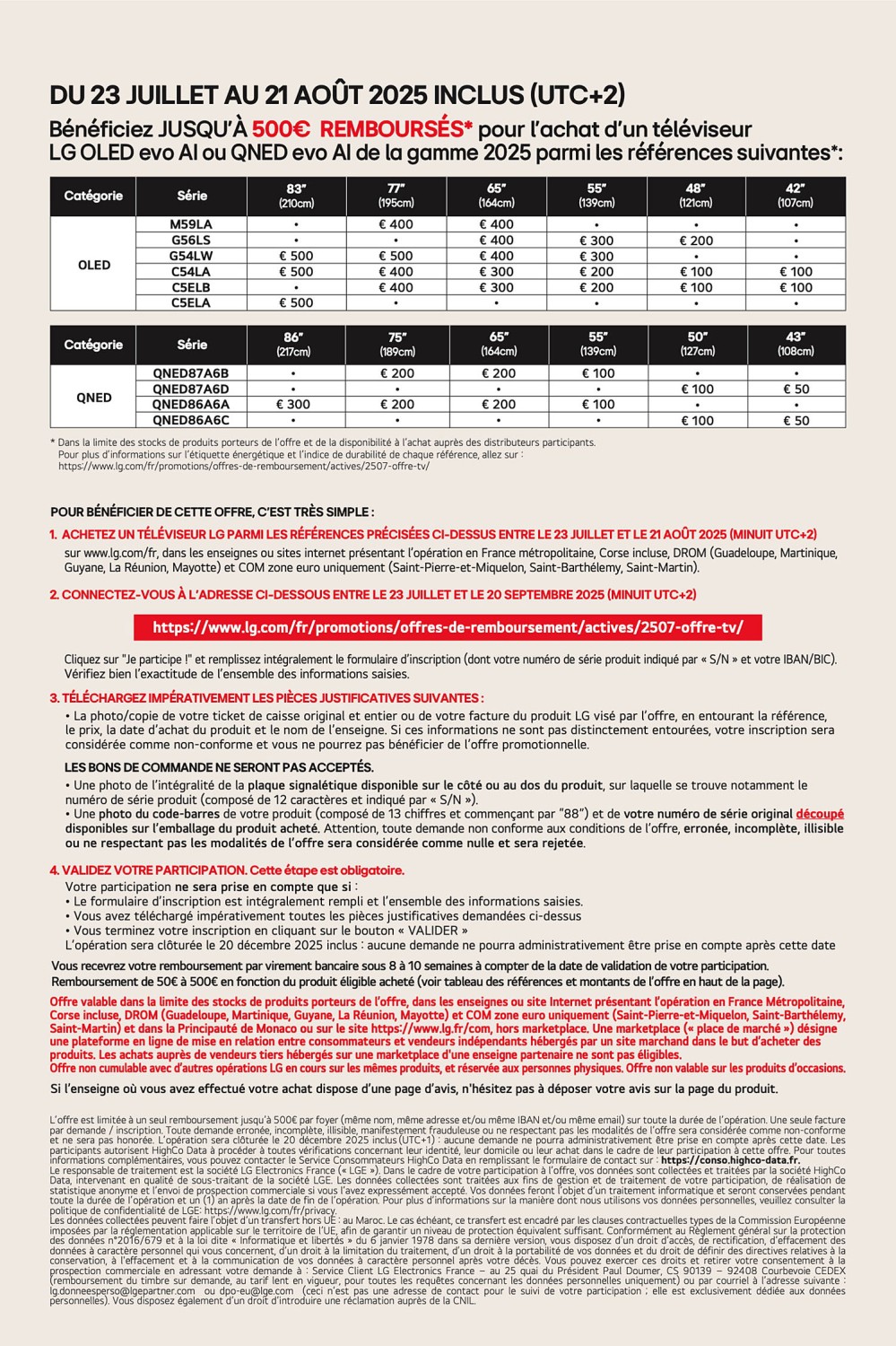 Todos los términos y condiciones de esta oferta están disponibles en el sitio web https://www.lg.com/fr/promotions/offres-de-remboursement/actives/2507-offre-tv/