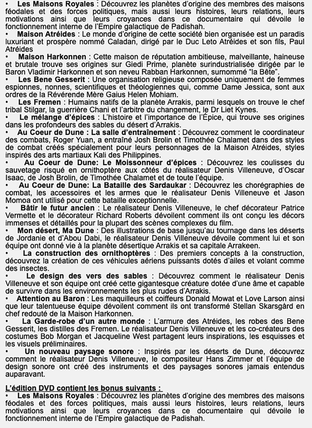 Las ediciones 4K y Blu-Ray estarán flanqueadas por una lÃnea de bonificaciones. No menos de 16 módulos para presentar las diferentes familias, explorar las escenas principales (ataque del recolector, asalto a Arrakeen, la capital de Dune), los decorados y los accesorios (ver captura de pantalla a continuación). O los dibujos preparatorios, el diseño de los vehÃculos, el vestuario asà como el impresionante trabajo sonoro de la pelÃcula. Sobre este último tema, la pelÃcula en 4K se ofrecerá en inglés Dolby Atmos Y finalmente en francés. Esperamos? ¡No podemos esperar!