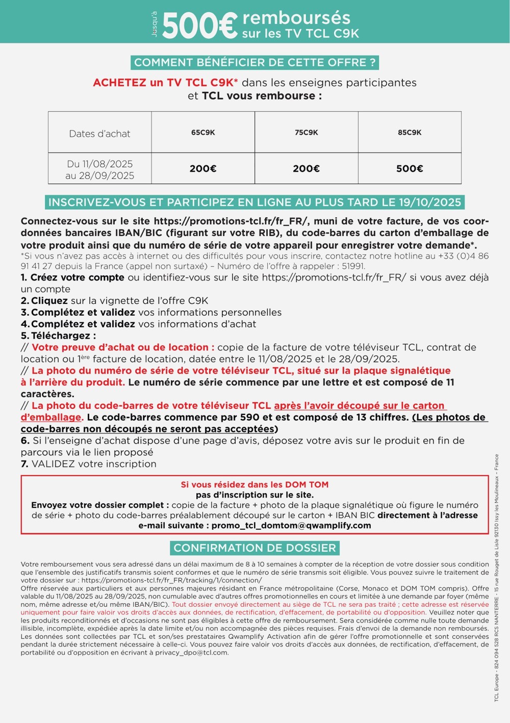 Hasta el 28 de septiembre, por lo tanto, por cualquier compra de un televisor LED Mini TCL C9K entre los modelos siguientes, la marca le reembolsará: