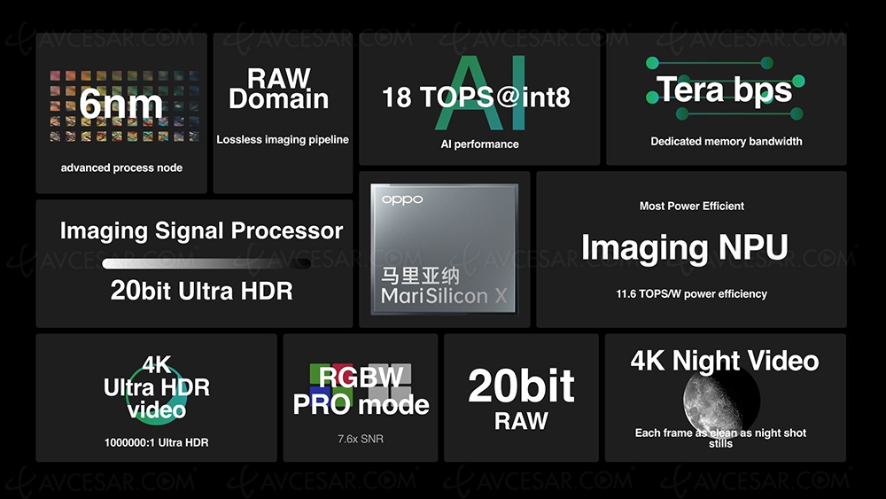 Por lo tanto, es compatible con el formato Raw, permitiendo, entre otras cosas, la captura de videos Ultra HD 4K. El MariSilicon X también está equipado con un potente procesador de señal de imagen especializado (ISP) para capturar instantáneas con un rango dinámico de 20 bits y 120 db, que es 4 veces el del Oppo Find X3 Pro. Los algoritmos de reducción de ruido garantizan videos nítidos y claros, y el procesador también ofrece un amplio rango dinámico y colores ricos. Finalmente, cabe destacar por primera vez en Android, la posibilidad de capturar videos nocturnos en HDR en calidad UHD 4K.