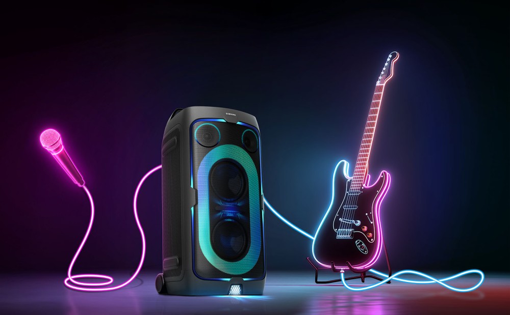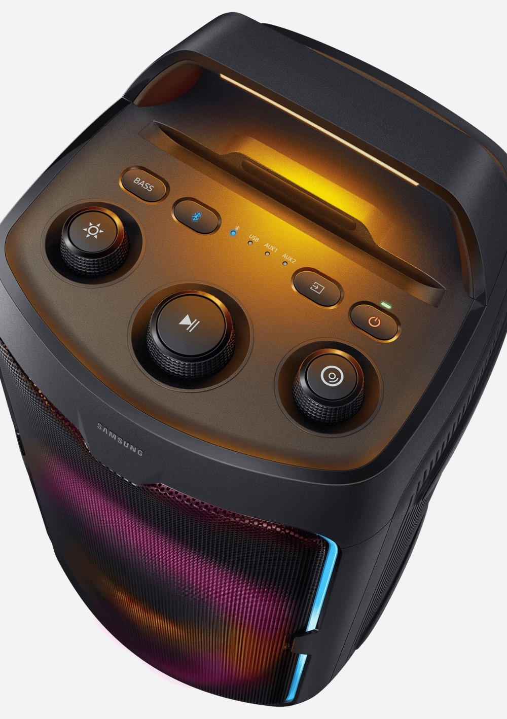 Además del sonido, también incluye iluminación con el modo Party Lights+. Ofrece cinco preajustes de ambiente y seis opciones de iluminación dinámica, todos personalizables mediante la app Samsung Sound Tower. Las docenas de [abc]LED[/abc] se sincronizan con el ritmo y las frecuencias de la música. Finalmente, cabe destacar la presencia de los modos Cabina de DJ y Karaoke, así como una entrada para guitarra.