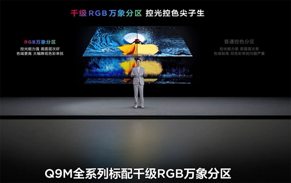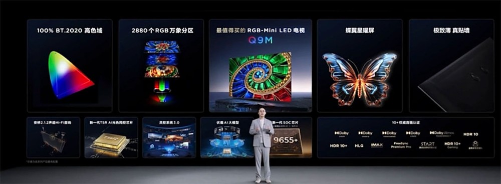 Las dos series [abc]RGB[/abc] Mini [abc]LED[/abc] de TCL, denominadas Q10M y Q9M, cambiarán, como es habitual, su nombre en Europa. La primera incluye tres modelos: 85", 98" y 115". Los siguientes cuatro: 65", 75", 85" y 98 pulgadas. En cuanto a especificaciones, el Q10M más exclusivo presenta varias innovaciones tecnológicas: brillo máximo anunciado de 9000 nits para más de 16 000 zonas, volumen de color del 91,3 %, cobertura del 100 % del espacio de color BT.2020, control de color de 120 bits (probablemente 30 bits por color + 10 bits para el panel, por cada color), nuevo panel WHVA Pro y sistema de sonido de Bang & Olufsen.