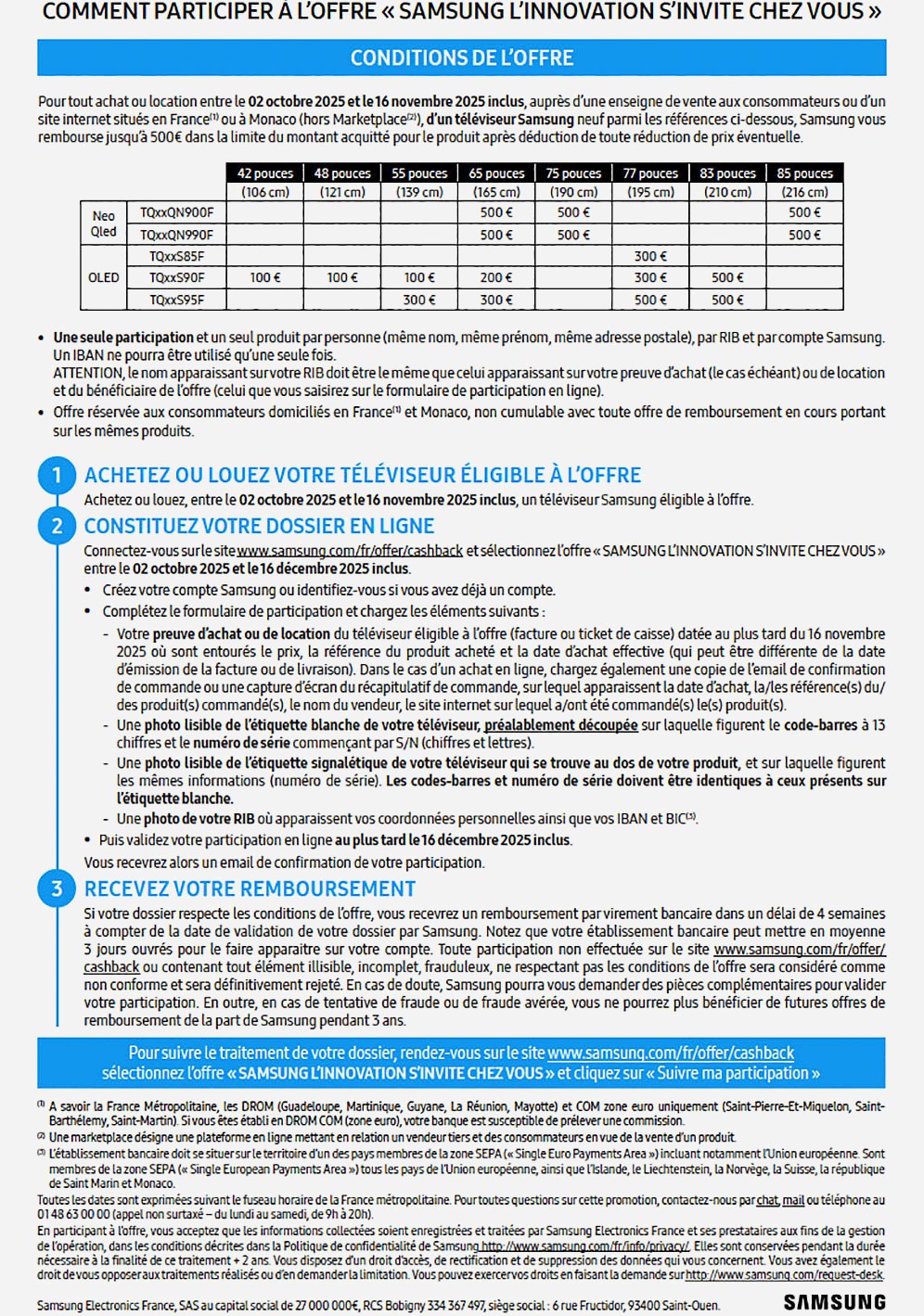 Más detalles sobre la oferta en las tiendas participantes o en el sitio web de la marca: www.samsung.com/fr/offer/cashback