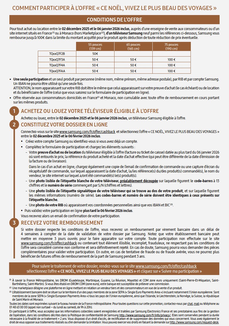 Hasta el 6 de enero de 2026, por la compra de cualquier televisor que se indica a continuación, la marca le reembolsará: • 50 € por un televisor Samsung TQ55Q7F2B, Samsung TQ55Q7F3A, Samsung TQ55Q7F4A, Samsung TQ55Q7FAA, Samsung TQ65Q7F3A, Samsung TQ65Q7F4A o Samsung TQ65Q7FAA • 100 € por un televisor Samsung TQ75Q7F3A, Samsung TQ75Q7F4A o Samsung TQ75Q7FAA